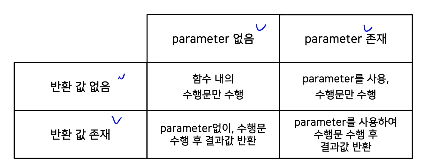 - parameter 유무, 반환 값(return value) 유무에 따라 함수의 형태가 다름