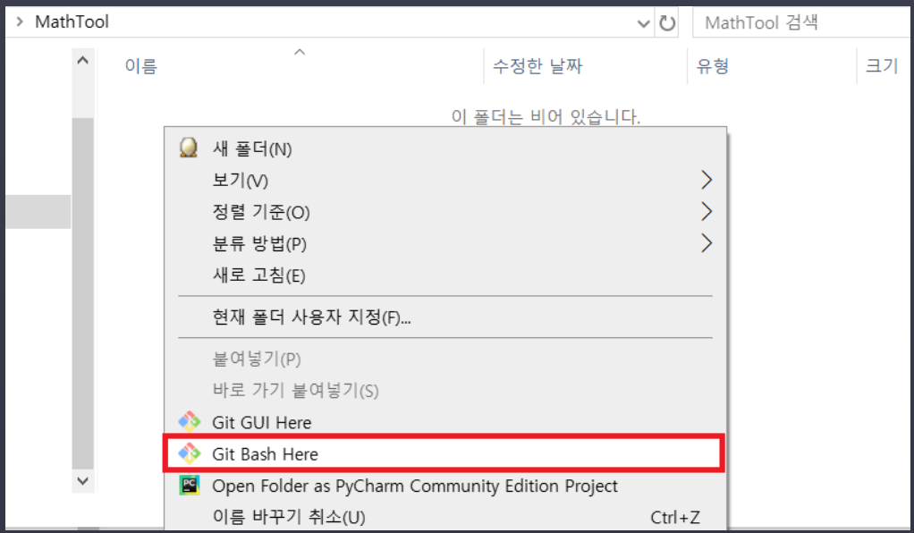 해당 폴더 안에서 오른쪽 버튼을 누른 다음에 'Git Bash Here'를 클릭하면 됩니다.