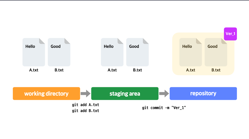 - git add A.txt와 git add B.txt를 실행해서 A.txt, B.txt 둘다 staging area에 올렸습니다.