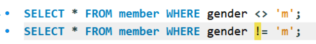 '같지 않음'을 표현하기 위해서는 !=나 <>기호를 사용하면 됩니다. 만약에 member 테이블에서 남자가 아닌 회원들을 조회하기 위해서는 아래와 같이 쿼리문을 작성하시면 됩니다.