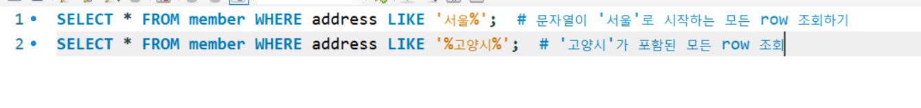 LIKE는 ~비슷한 이라는 뜻을 가지고 있습니다. 그래서 특정 문자열이 포함되어 있는 row를 출력하는 방법에 대해 배워보겠습니다. %기호를 '서울%'처럼 뒤쪽에 붙여주게 되면 앞 글자가 서울로 시작하는 row를 조회하는 쿼리문이 됩니다. '%고양시%'처럼 %기호를 앞 뒤쪽에 모두 붙여주게 되면 '고양시'가 포함된 모든 row를 조회한다고 생각하면 됩니다.