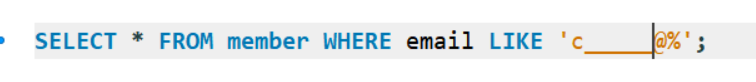 LIKE 뒤의 _(언더바) 하나는 문자 하나는 나타냅니다. 아래 쿼리문은 email이 c로 시작하고 소문자가 5글자가 들어가고 나서 @하나 그 뒤에 임의의 길이를 가진 문자열이 있는 문자 패턴을 나타냅니다.