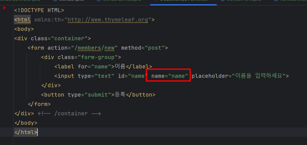 name에 들어가는 값을 키와 value에 형태로 MemberForm의 name에 전달하게 된다.