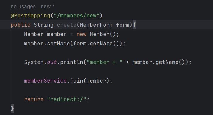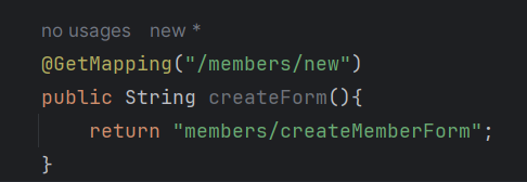 GetMapping 어노테이션을 통해서 members/new라는 url에 접근하게 되면 templates라는 폴더 안에서 createMemberForm이라는 html 파일을 찾고 돌려주게 된다.