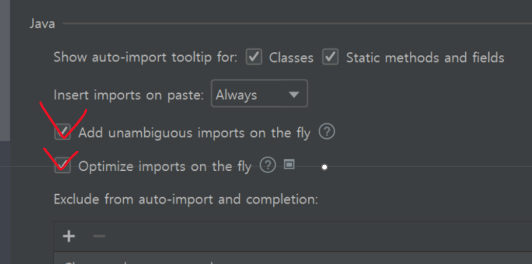 'Auto Import’항목을 체크하지 않았다면 소스 코드를 입력할 때 코드에 빨간색이 표시되기도 합니다. 이는 클래스를 찾을 수 없어서 생기는 문제이니 Auto Import를 설정을 해주면 됩니다.
