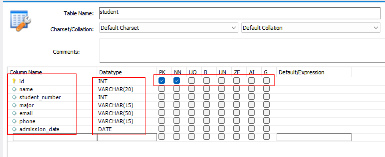 student이름의 테이블을 생성해보도록 할게요. Table Name에는 student라는 이름을 적어주고 컬럼의 이름을 적어줄게요.