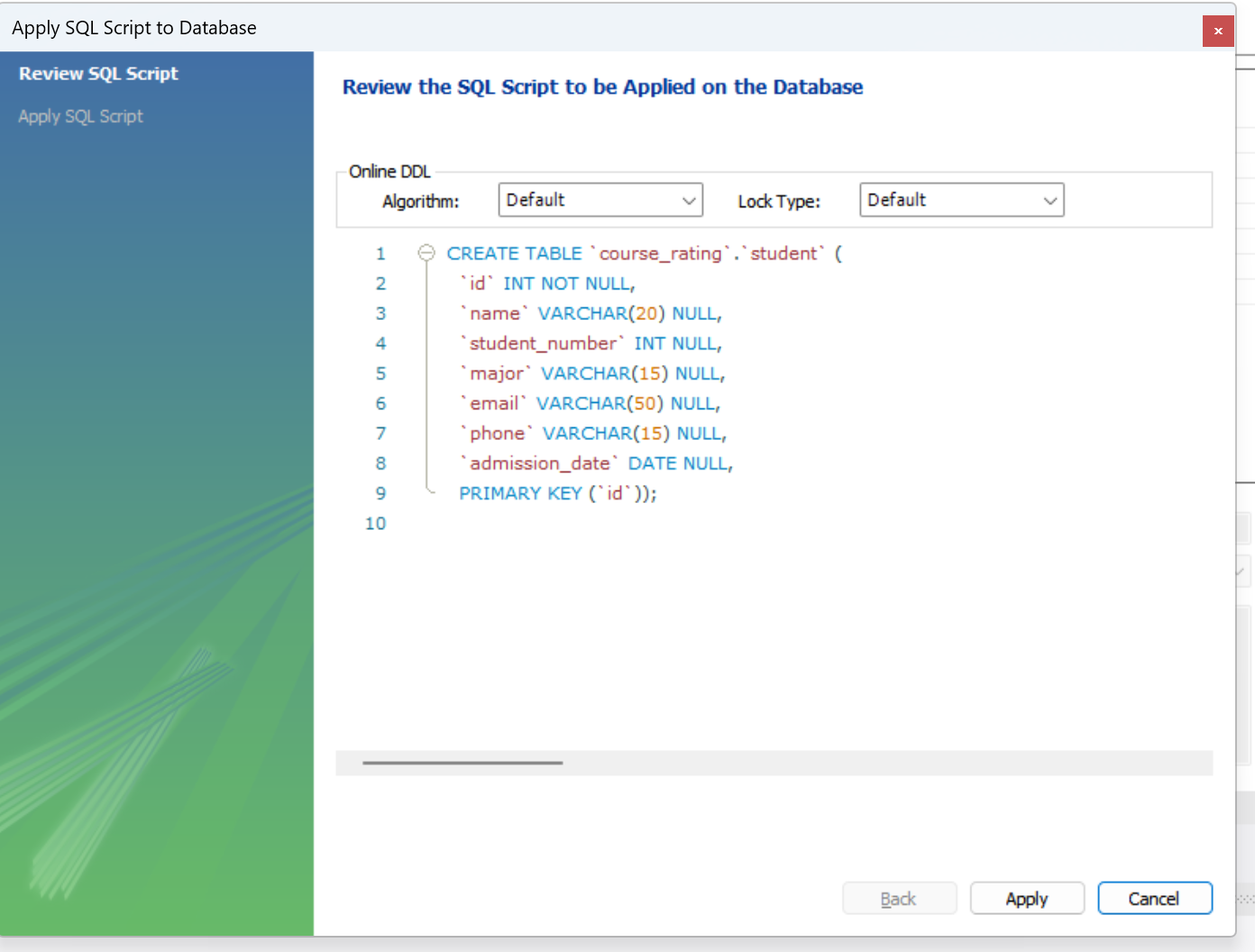 각 컬럼의 제약조건과 자료형을 설정해주고 apply 눌러주면 아래와 같은 창이 뜨게 됩니다. 아래 sql 구문은 테이블을 생성해주는 sql 쿼리를 자동으로 만들어주게 됩니다.