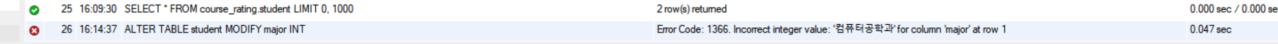 MODIFY 는 '수정하다, 변경하다'라는 뜻을 가지고 있습니다. MODIFY 일반적으로 데이터타입 및 속성을 변경할 때 사용합니다. major 라는 컬럼의 데이터 타입을 INT 형으로 변환하는 것이죠. 해당 SQL문을 실행하게 되면 아래와 같은 에러가 발생하게 됩니다. ??!!
