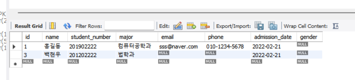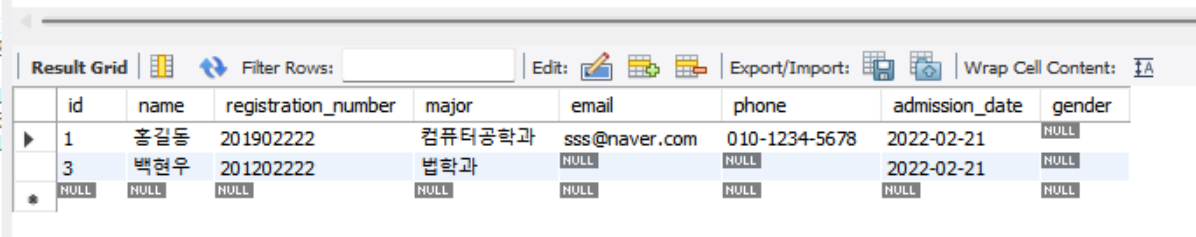 SQL문을 실행하고 다시 테이블을 조회해보면 admission_date컬럼이 삭제된 것을 확인할 수 있습니다.