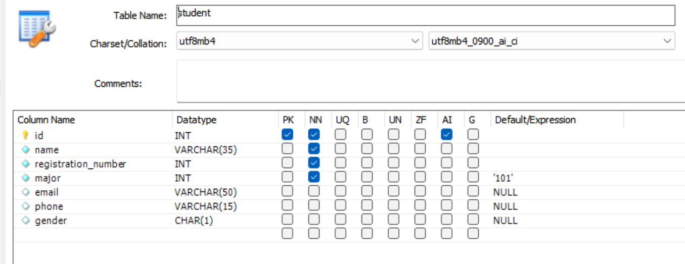 student 테이블을 보게 되면, email, phone, gender라는 컬럼의 Default 값에 NULL 이라는 값이 적혀있습니다. 즉 3개의 컬럼에는 값을 넣지 않게 되면 NULL이라는 값이 설정된다는 뜻입니다. 이번에는 NN속성이 있는 컬럼에도 DEFAULT 속성을 설정하도록 할게요.