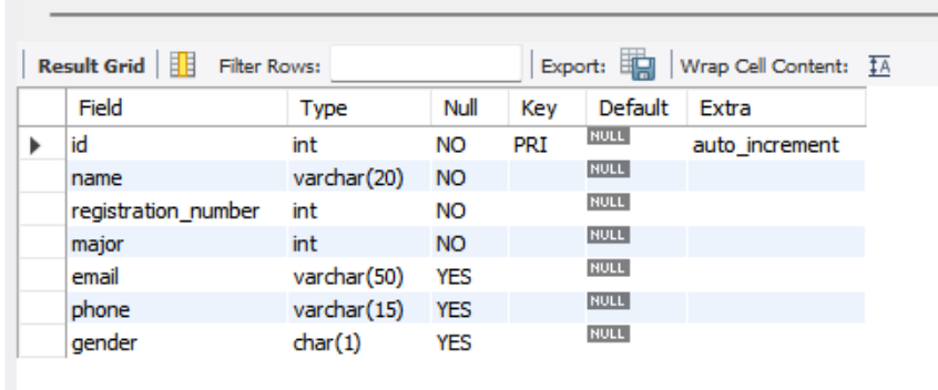 이 상태에서 name , registration_number 컬럼만 있는 상태로 값을 추가하고 테이블의 값을 확인해보도록 할게요.