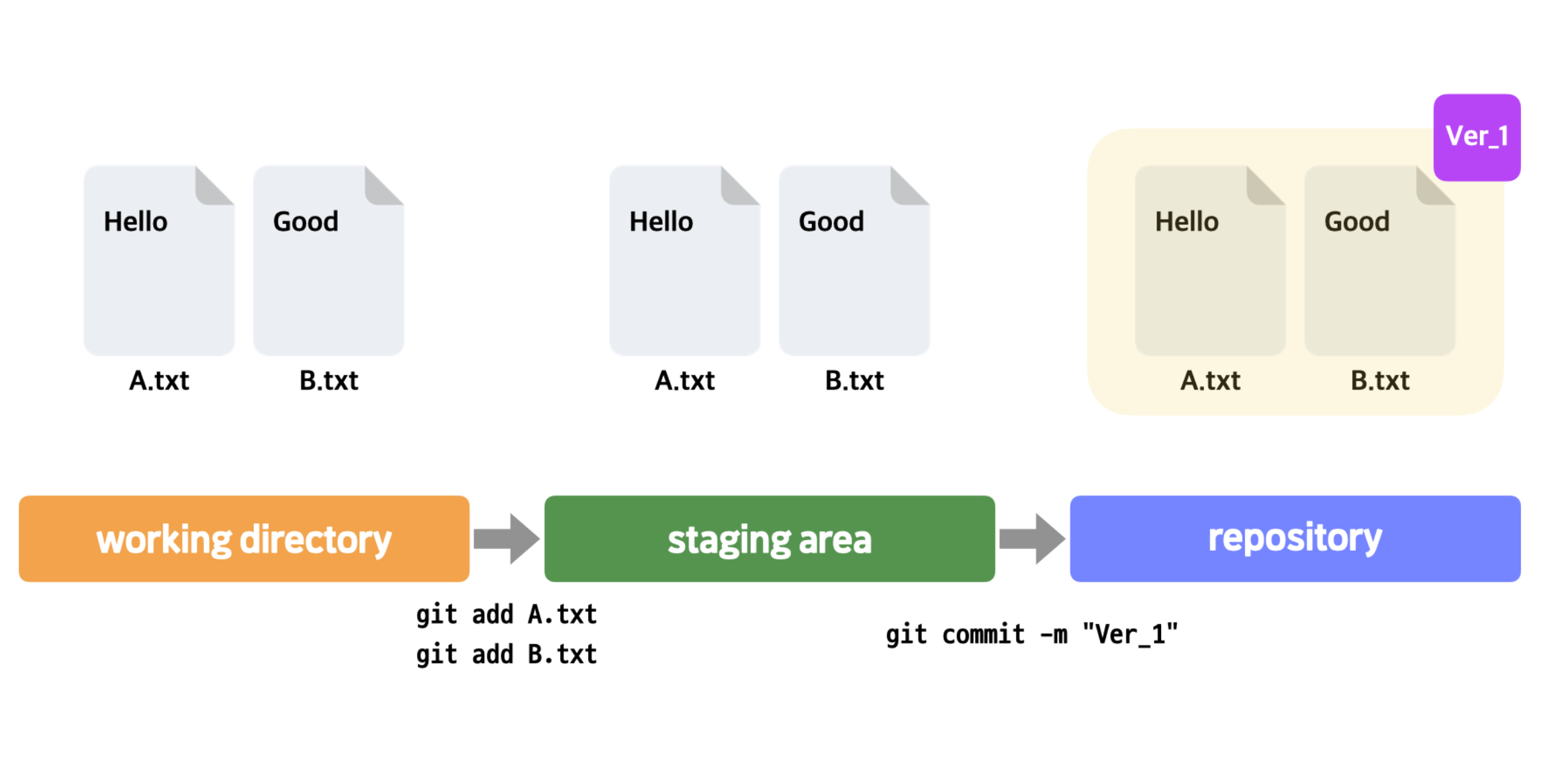 해당 내용들을 풀어서 생각해 보면,working directory에서 작업하기 -> 작업한 파일들 git add 하면 staging area에 영역으로 -> 커밋을 하게 되면 staging area에 있던 파일들이 repository에 저장