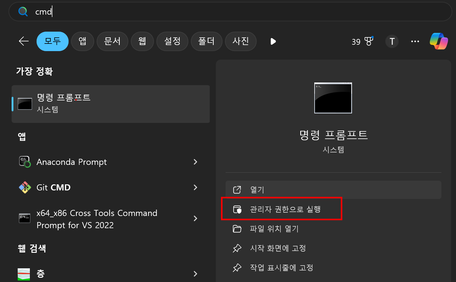 먼저, cmd(명령 프롬프트)를 관리자권한으로 실행합니다.