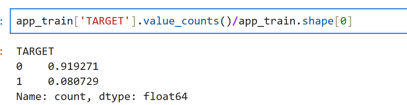 해당 코드는 value_counts()를 통해 각 target의 갯수를 구하고 이를 app_train의 전체 행으로 각각 나눠주게 되면 각 target값의 비율을 확인해볼 수 있습니다.