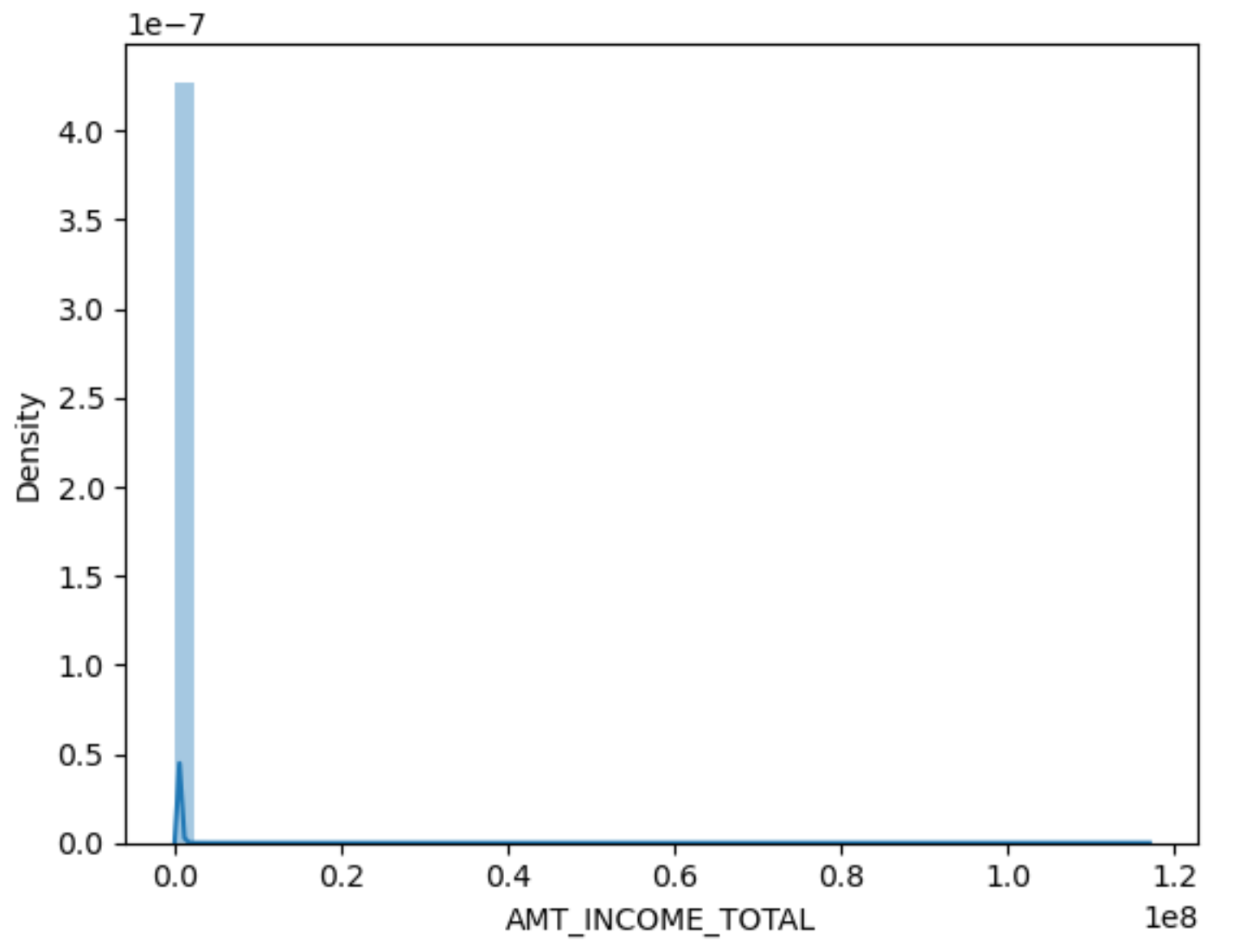seaborn을 distplot 메서드를 활용하여 'AMT_INCOME_TOTAL' 데이터의 분포를 확인할 수 있다. 대부분의 데이터가 0.2이하에 몰려있는 것을 확인할 수 있다. AMT_INCOME_TOTAL은 고객의 소득을 나타내는 데이터이다.