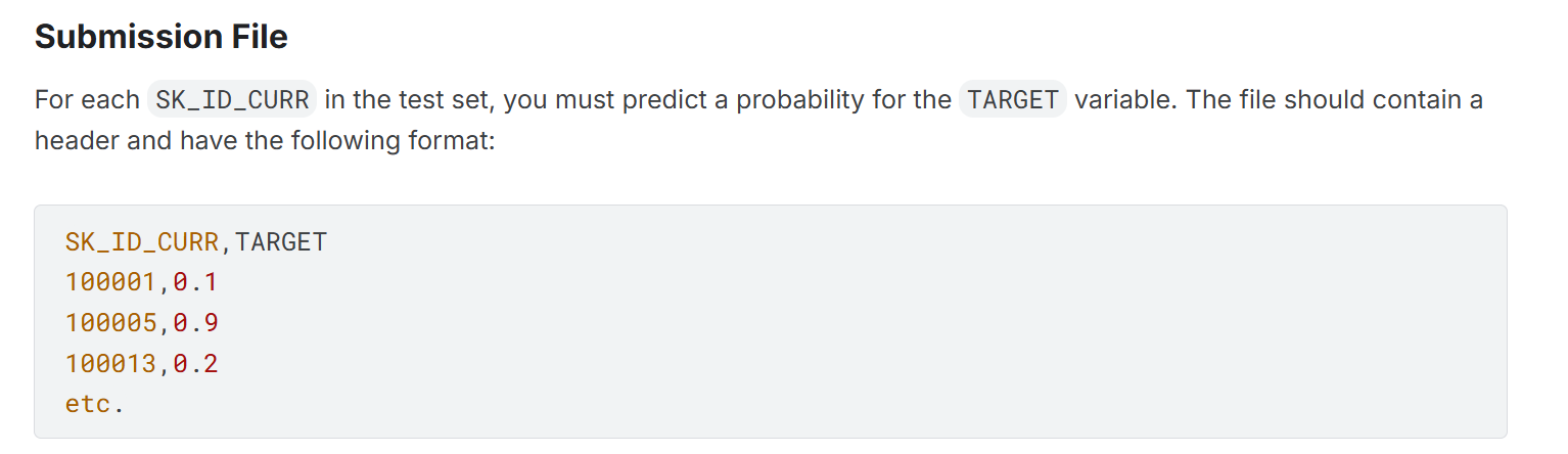 간략하게 설명하자면 사용자의 데이터를 통해 어떤 사용자가 은행 채무를 불이행할지를 예측하는 모델을 만드는 것입니다. 평가 기준은 ROC curve를 통해서 평가를 진행하게 됩니다. 제출해야되는 형태는 아래 사진과 같이 SK_ID_CURR과 TARGET 값이 나오는 csv파일을 제출하게 됩니다. TARGET에 들어가는 데이터는 채무 불이행을 할지 즉, 1인 확률이 들어간다고 생각하면 됩니다.