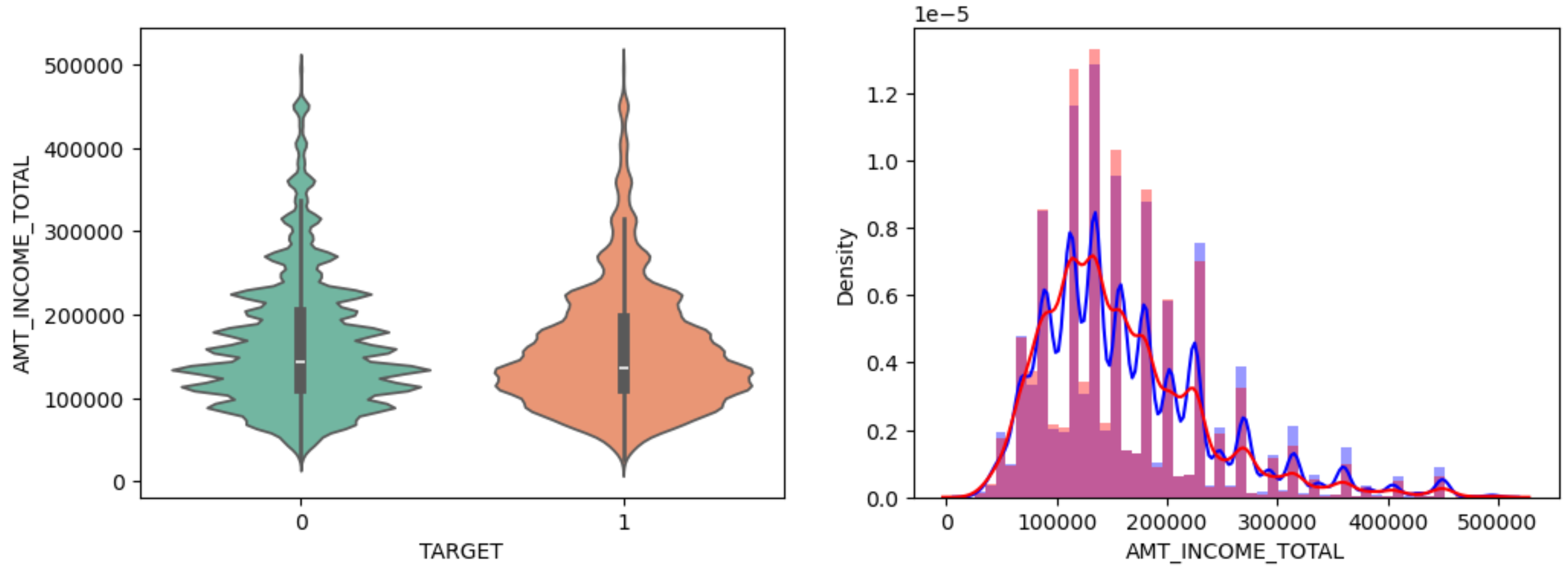 show_columns_hist_by_target 함수는 TARGET 데이터에 따른 violinplot과 distplot을 그려주는 코드이다.